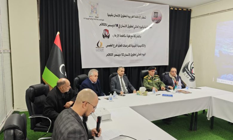 شهدت مدينة الخُمس، صباح اليوم الأربعاء، تنظيم احتفالية بمناسبة اليوم العالمي لحقوق الإنسان، وذلك بمبادرة مشتركة بين المنظمة العربية لحقوق الإنسان بليبيا وقوة مكافحة الإرهاب والأكاديمية الليبية للدراسات العليا – فرع الخمس، وبحضور ممثلين عن المؤسسات الأمنية والمدنية وعدد من الباحثين والمهتمين بالشأن الحقوقي.